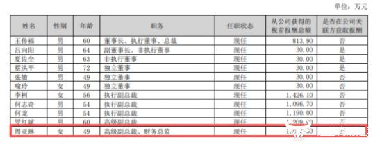 除了周亚琳之外,比亚迪执行副总裁李柯获薪1426.1万元,执行副总裁何志奇1096.7万元,高级副总裁罗红斌1209.9万元,执行副总裁何龙1190万元,高级副总裁杨冬生1001万元,而董事长王传福同期的薪酬为813.9万元。